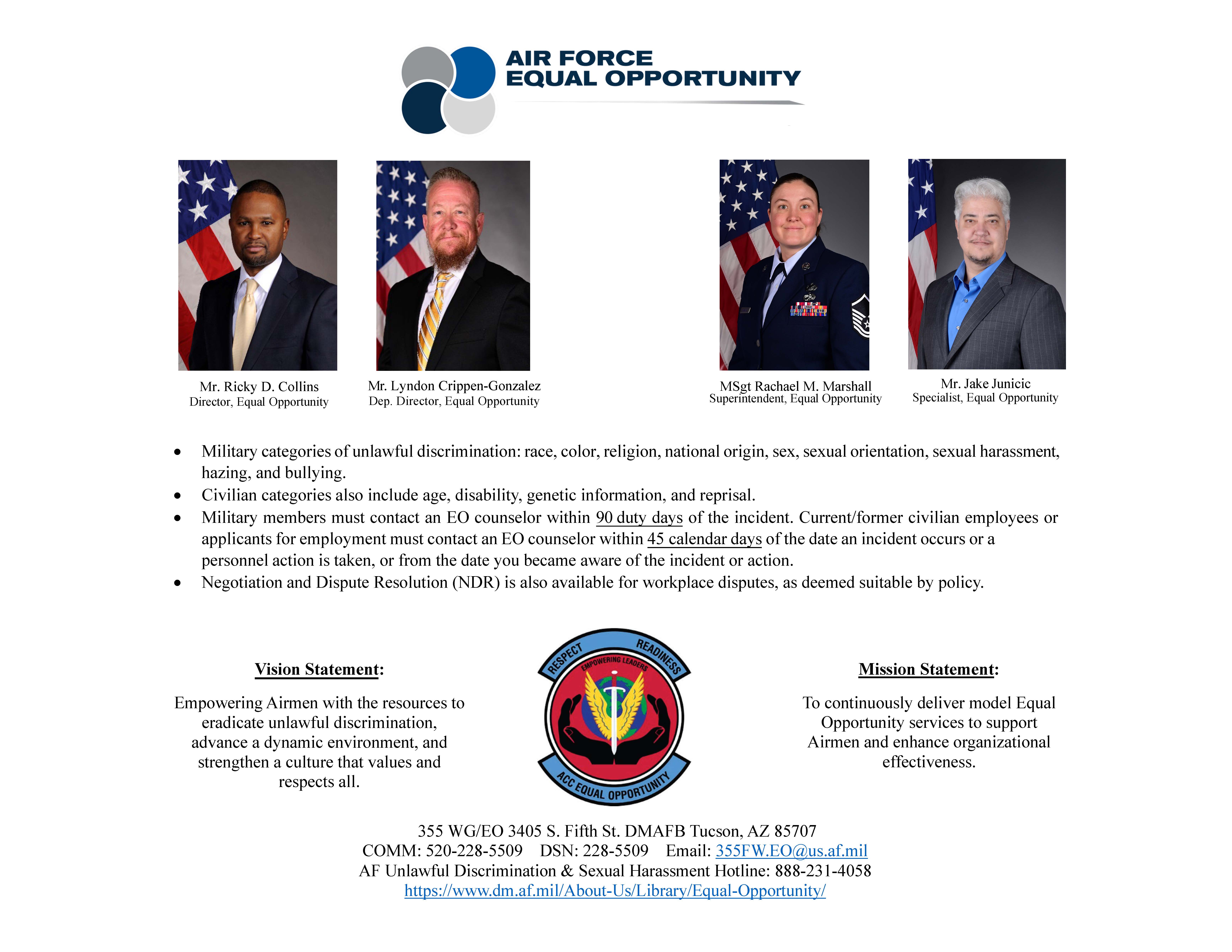 The Equal Opportunity staff provides training, conducts informal inquiries, coordinates complaint investigations and conducts mediation of workplace disputes in the civilian workforce. They also provide human relations training, guidance in formal and informal equal opportunity and treatment complaints processing, conduct complaint clarifications, mediate complaints, and provide awareness training on numerous subjects relating to human relations (i.e., sexual harassment and team building).