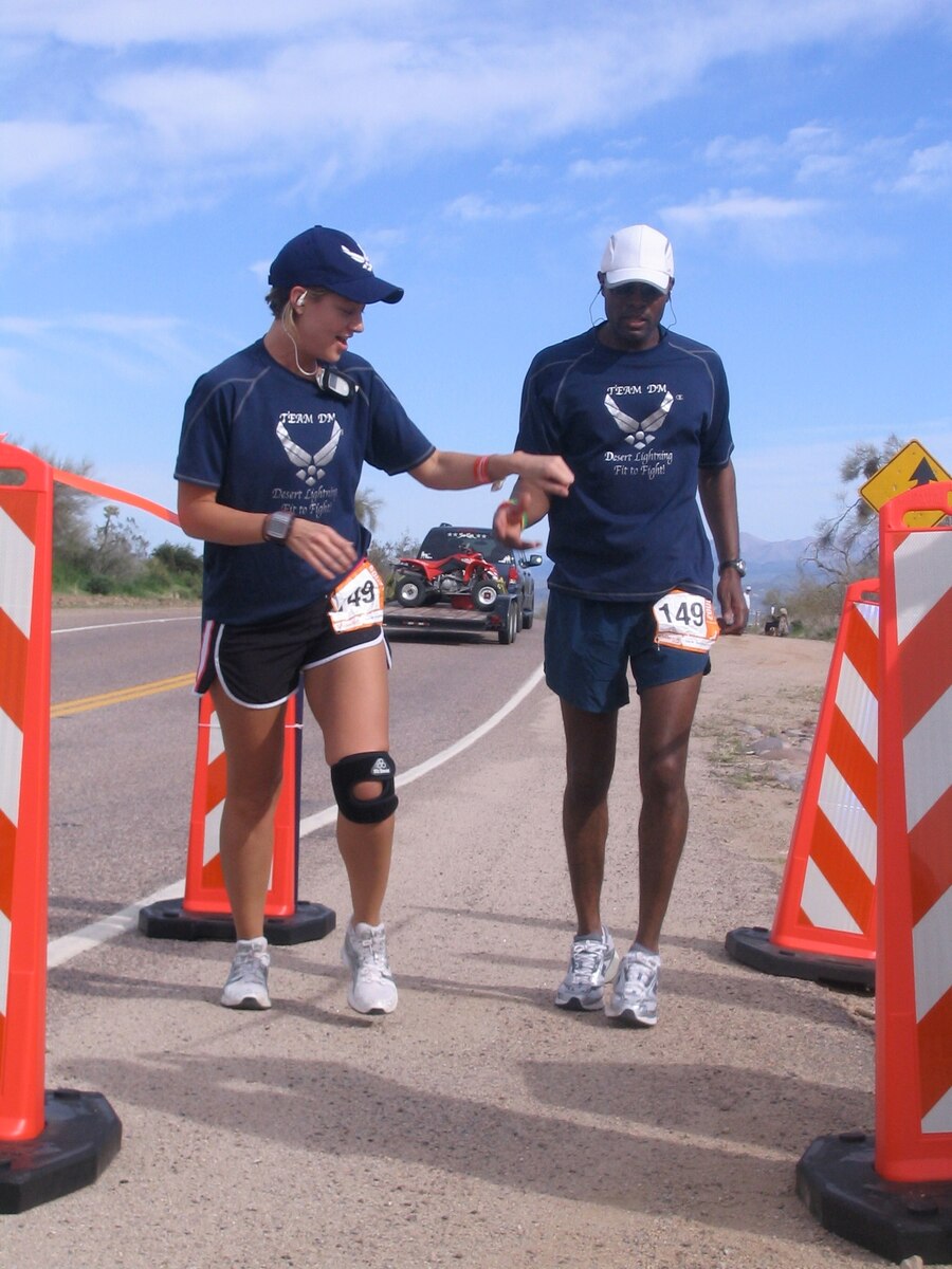 From Wickenburg to Mesa … on foot Published March 4, 2008 By Staff Sgt. Tim Beckham 355th Fighter Wing Public Affairs DAVIS-MONTHAN AIR FORCE BASE, Ariz. -- Most people probably haven't heard of the small town of Wickenburg, Ariz. After all, the high-desert town, which is home to only about 5,000 people and is famous for giving the right-of-way to horses, kind of gets lost on the map. But on Feb. 29 Wickenburg was the starting point for 10 D-M members who embarked on a 182-mile journey to Mesa, Ariz. ... on foot. "We did this to promote physical fitness in the Air Force, reinforce our warrior ethos and to raise money for Chances for Children, which is an Arizona children's charity," said Tech. Sgt. Diane Burleson, 355th Fighter Wing unit deployment manager and the team captain of Team D-M - Desert Lightning Fit to Fight. The Ragnar Relay del Sol was a relay-style race, with each member of the team running various distances. "Each person ran at their own pace," said Sergeant Burleson. "It was a relay race and the 10 members each ran their three designated legs of the race, which were about six hours apart." The 182-mile run took the 10-person team just 23 hours and 44 minutes to complete, but it didn't come without enduring some early setbacks. "In the days leading up to the race we lost three runners to injury, one to a short notice deployment, and another to PCS orders," said Sergeant Burleson. Luckily, three of Team D-M's alternates jumped at the chance to participate in the race. To make up for the two missing runners Sergeant Burleson asked four of the team members to take on additional legs of the race. "Amazingly the response was, 'Whatever you need, I just want to run with you guys,'" said Sergeant Burleson. Two runners short of a complete team, D-M took the finish line by storm. "We finished in 23rd place overall out of 151 teams and captured the first place award in the Public Service division," said Sergeant Burleson. "I will tell you that at the moment of victory not one of us could or would have tried to take credit for the feeling of accomplishment that overcame us - we looked at our teammates with pride and amazement knowing every single one of us gave our all." 10 runners, 2 drivers, 23 hours, 182 miles "During the preparation for this race, it became clear just how awesome our Air Force family is," said Sergeant Burleson. "Here we were, 12 people who didn't know each other, seamlessly coming together as a team to accomplish a goal. We all had one thing in common-wanting to show what our Air Force can do and what our Airmen do every day-not for glory but for pride." In the end it wasn't about finishing first, medals or trophies, it was about a team coming together to accomplish a common goal. "Ten random Airmen volunteered to run together and they reminded me that with steadfast drive and enthusiastic determination, you can do anything and everything you put your mind to," said Sergeant Burleson. "When you allow yourself to rely on others and believe in them your capabilities increase tenfold." The final running team for D-M consisted of six men and four women ranging in age from 19 to 46. Below are Team D-M's participants: 1st Lt. Joshua Singsaas, (27.4 miles), Staff Sgt. Michael Senigo, (21.8 miles), Senior Airman Dustin Kuuttila, (21.8 miles), Chief Master Sgt.(Ret.) Jeffrey Halstead, (18.3 miles), Airman 1st Class David White, (17.6 miles), 1st Lt. Cristina Luis, (16.3 miles), Senior Airman Tamara Schonerstedt, (15.9 miles), 1st Lt. Elithe Zoglman, (14.7 miles), 1st Lt. Anthony Simpson, (14.6 miles), and Tech. Sgt. Diane Burleson, (13.3 miles). In addition to lodging provided by Marriott and supplies from the 355th Medical Group, Trader Joe's, and Performance Footwear, Team D-M also received financial support from Dorothy Finley, Military Affairs Committee, the D-M 1st 6 Council, the D-M Chief's Group, the Maricopa County Superior Court Probation Department, the 355th Mission Support Group, the 355th Comptroller Squadron, and the teams two drivers, Laszlo Otvos and Danele Elliott. The group also received personal donations from Col. Kent Laughbaum, 355th Fighter Wing commander, Col. Bruce McClintock, 355th FW vice commander, and Col. Hal Hoxie, 355th MSG commander.