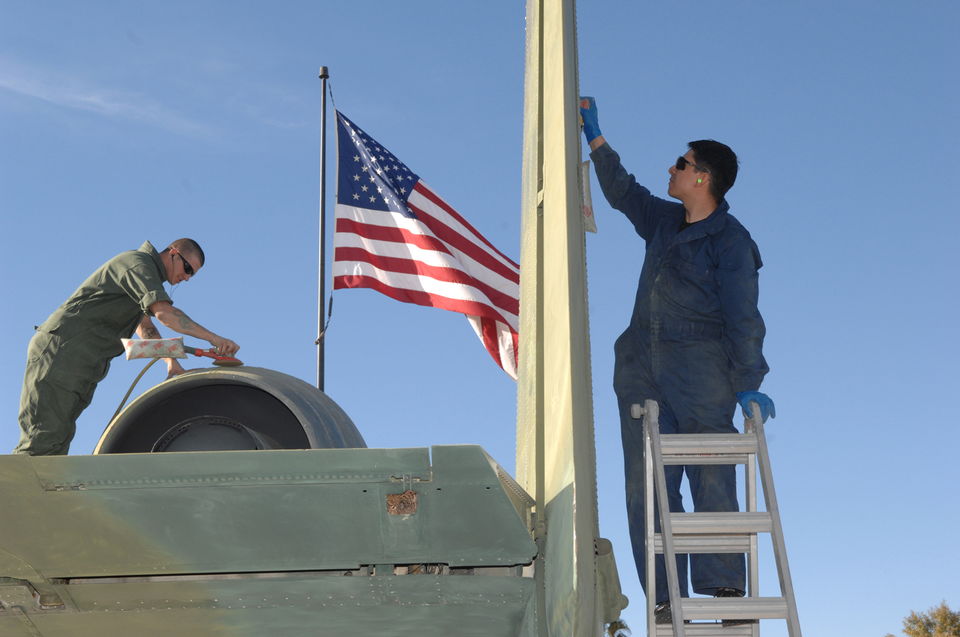 Airmen First Class David Lopez, right, and Kevin Hetzler, both 355th Equipment Maintenance Squadron sheet metal journeymen, sand down an old A-10 at Heritage Park Jan. 25. All nine planes at the park will receive restoration over the next few months to get ready for the 355th Fighter Association 65th Annual Reunion April 24 to 27. (U.S. Air Force photo by Senior Airman Alesia D. Goosic)
