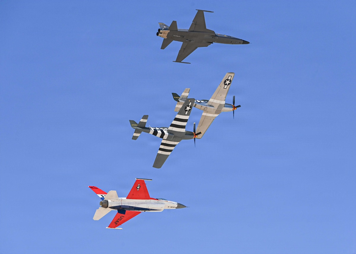 commander, performs an aerial maneuver during Heritage Flight Training Course at Davis-Monthan Air Force Base, Arizona, March 1, 2026. The demonstration profile can include up to 18 maneuvers, with the pilot experiencing up to nine times the force of gravity, or nine Gs, and traveling just under the speed of sound at 700 miles per hour. (U.S. Air Force photo by Senior Airman William Finn V)
