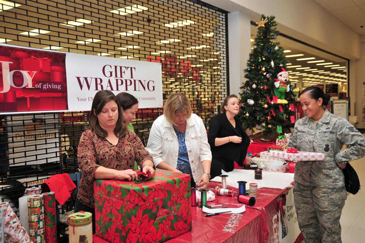 Lauren McKay, a member of the Officer’s Spouse’s Club, delivers a wrapped gift to a customer at the Base Exchange at Davis-Monthan Air Force Base, Ariz. Dec. 12, 2013. Members of the OSC volunteer to wrap gifts at the BX in exchange for donations which fund scholarship initiatives base-wide. (U.S. Air Force photo by Senior Airman Josh Slavin/Released)