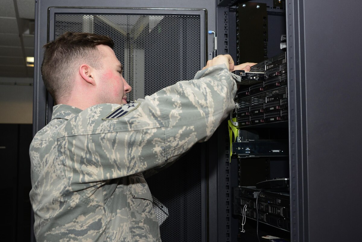 U.S. Air Force Senior Airman David Cruz, 355th Communications Squadron network operations technician, installs Windows Server 2008 on a print server at Davis-Monthan Air Force Base, Ariz., Sept. 7, 2016. The network operations team keeps base systems compliant with the standards of the Defense Information Systems Agency by using software, hardware and scripting solutions. (U.S. Air Force photo by Senior Airman Betty R. Chevalier)