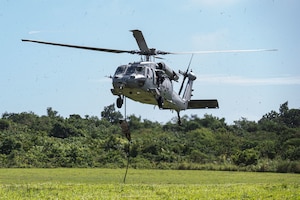 U.S. Air Force Airmen with the 824th Base Defense Squadron and 11th Combat Air Base Squadron set up a perimeter under a U.S. Navy MH-60 Sea Hawk with Helicopter Sea Combat Squadron 25 during during fast-rope insertion training at Andersen Air Force Base on Nov. 20, 2025.