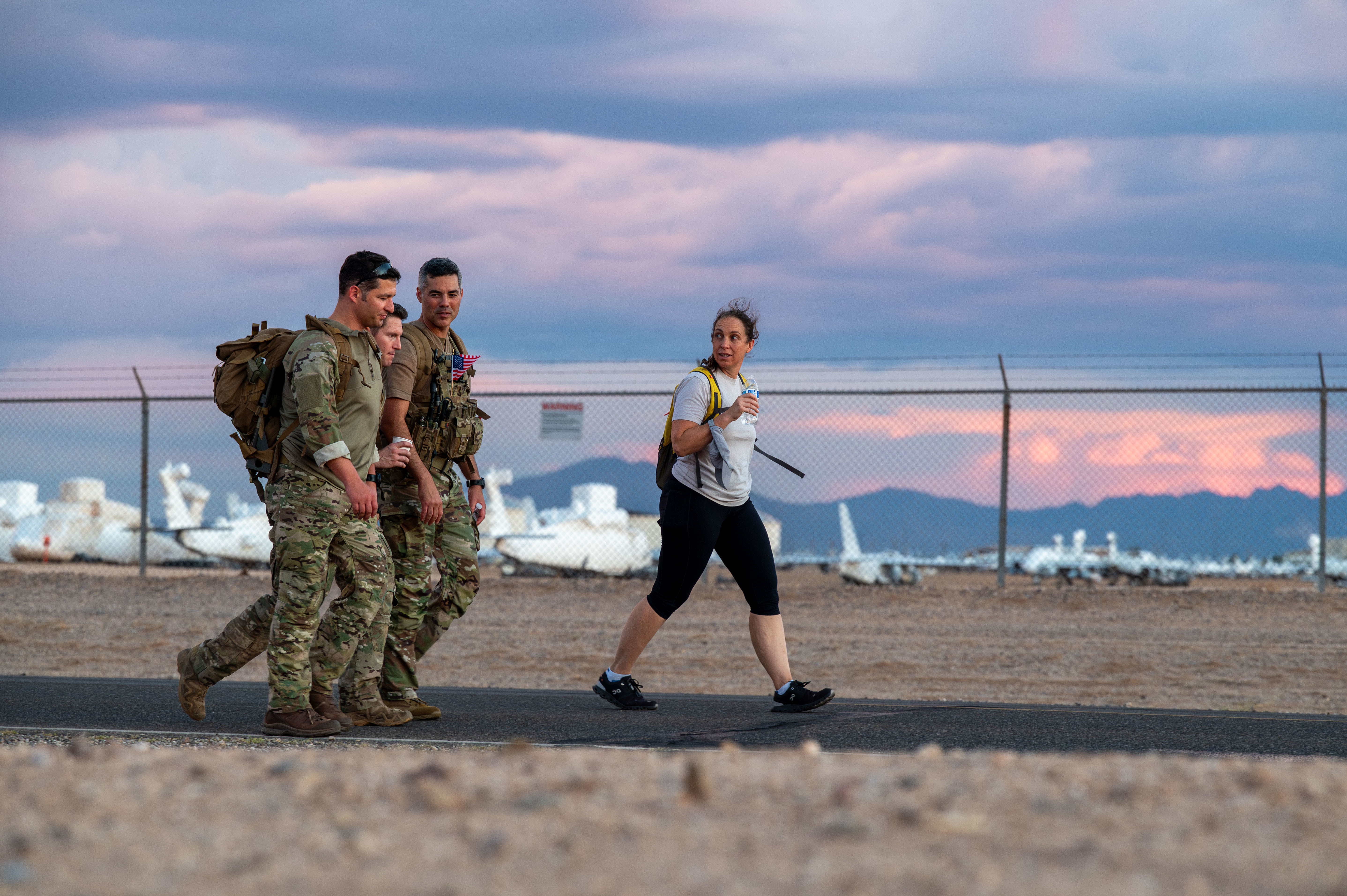 U.S. Air Force Col. Charles Redmond, 355th Wing deputy commander, left; Chief Master Sgt. Kelvin Hatcher, 355th Wing command chief, center; and Lt. Col. Patrick Chapman, 355th Operations Group deputy commander, participate in the 9/11 Memorial Sunset Ruck at Davis-Monthan Air Force Base, Arizona, Sept. 11, 2025. The event provided an opportunity to commemorate the heroes of the Sept. 11, 2001 attacks. (U.S. Air Force photo by Senior Airman Jasmyne Bridgers-Matos)
