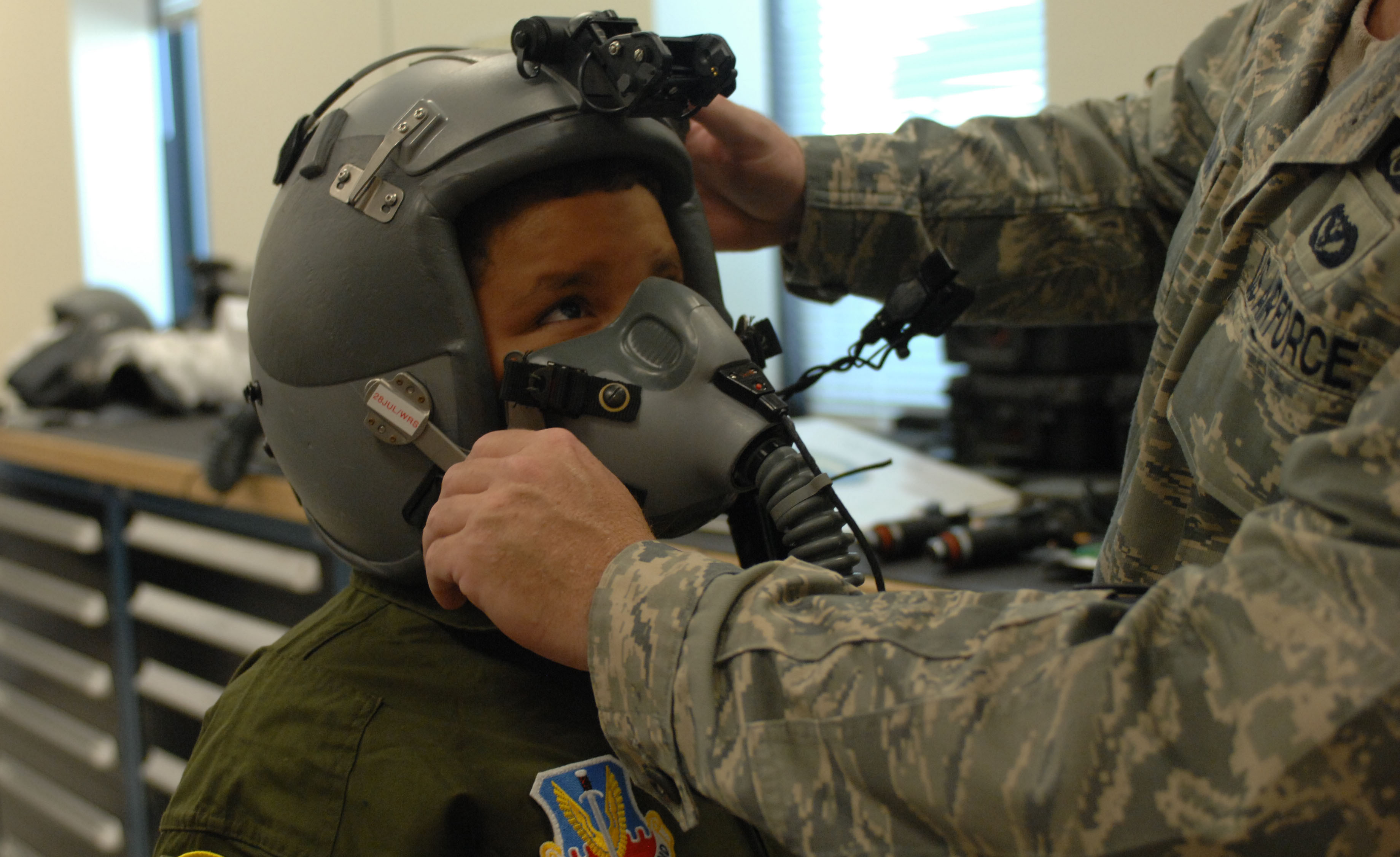 Tech Sgt. Brian Graham, 563rd Operations Support Squadron aircrew flight equipment, help Abrium Reyes, a 10-year-old Tucsonan recovering from Acute Lymphoblastic Leukemia, put on an oxygen mask during the Pilot for a Day program May 16, 2013 at Davis-Monthan Air Force Base, Ariz. The Pilot for a Day program allows children with chronic or serious conditions to become an honorary member of the 355th Fighter Wing and one of the base's flying units for a day. (U.S. Air Force photo by Airman 1st Class Betty R. Chevalier/released)