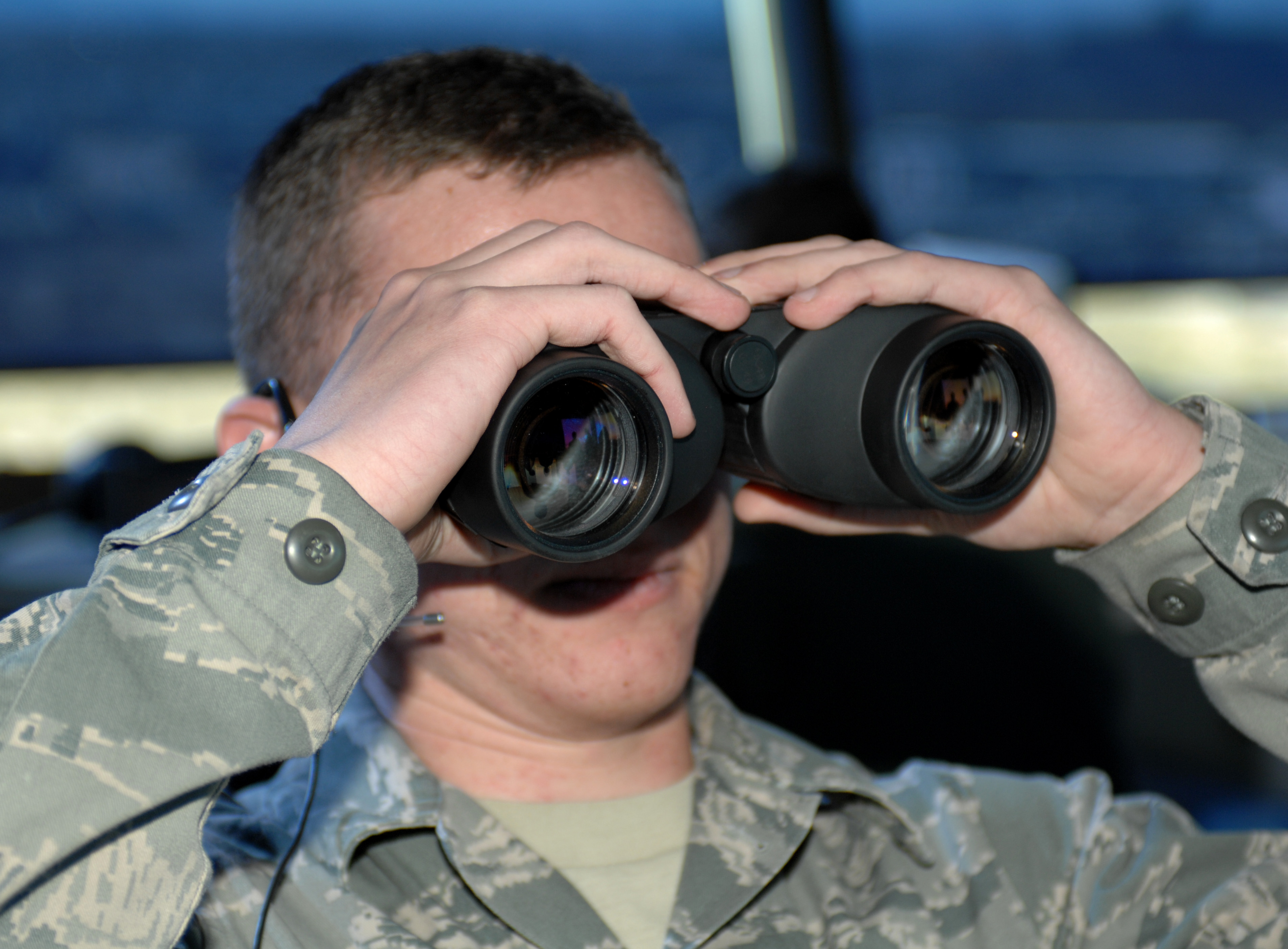 U.S. Air Force Airman 1st Class Kirk Kinzer, 355th Operations Support Squadron air traffic controller apprentice, uses binoculars from the control tower to watch aircraft traffic on the flightline at Davis-Monthan Air Force Base, Ariz., Jan. 25. Because the control tower is located far away from the runway, air traffic controllers often use binoculars to get a close up look of the aircraft. (U.S. Air Force photo by Airman 1st Class Michael Washburn/Released)