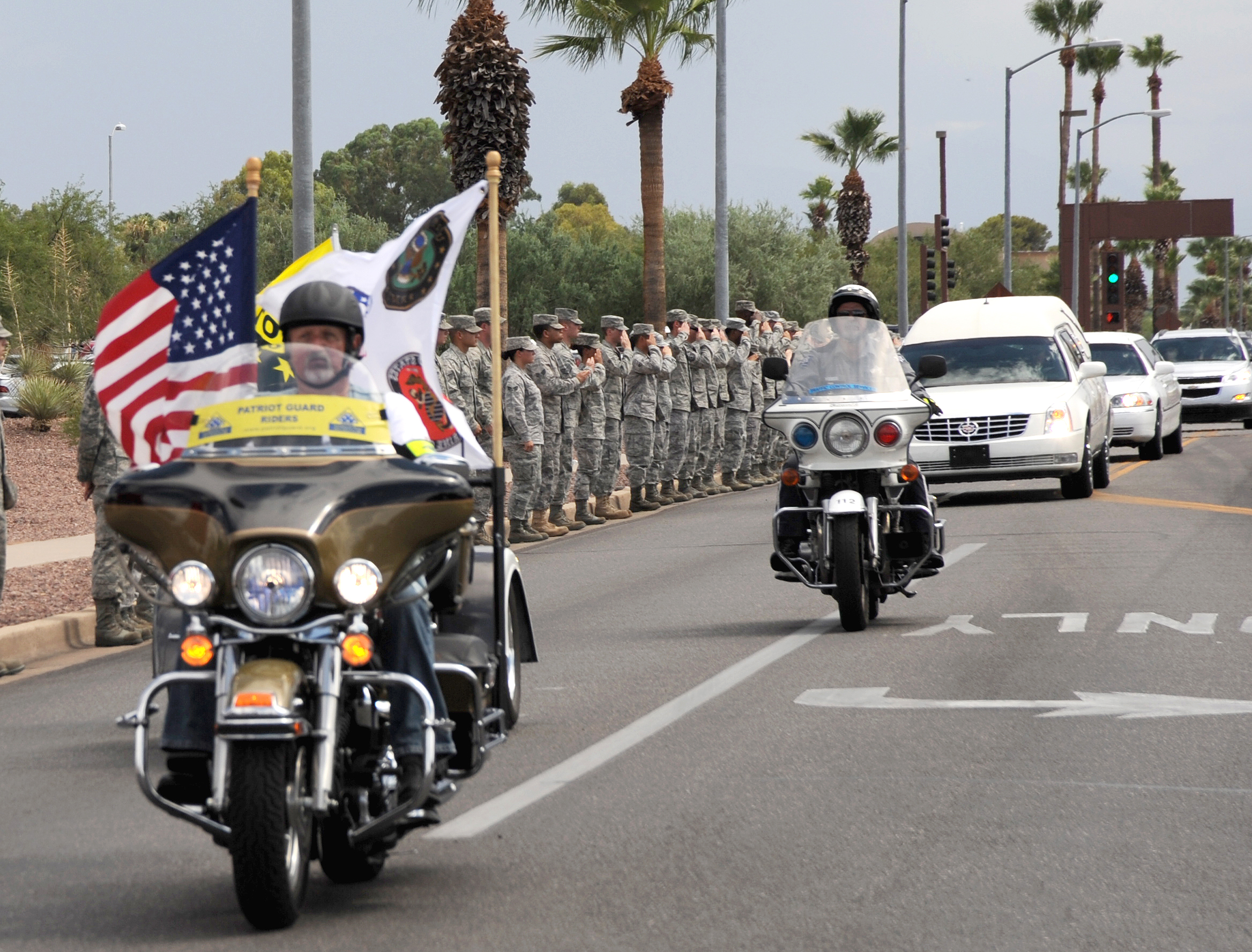 Davis-Monthan Airmen line the street as the remains of fallen Army Spc. Christopher Moon travel in procession down Craycroft Road here July 23, 2010. Specialist Moon, a graduate of Tucson High School, was killed July 13 by a roadside bomb in Afghanistan. He was 20 years old. (U.S. Air Force photo/Airman 1st Class Jerilyn Quintanilla)