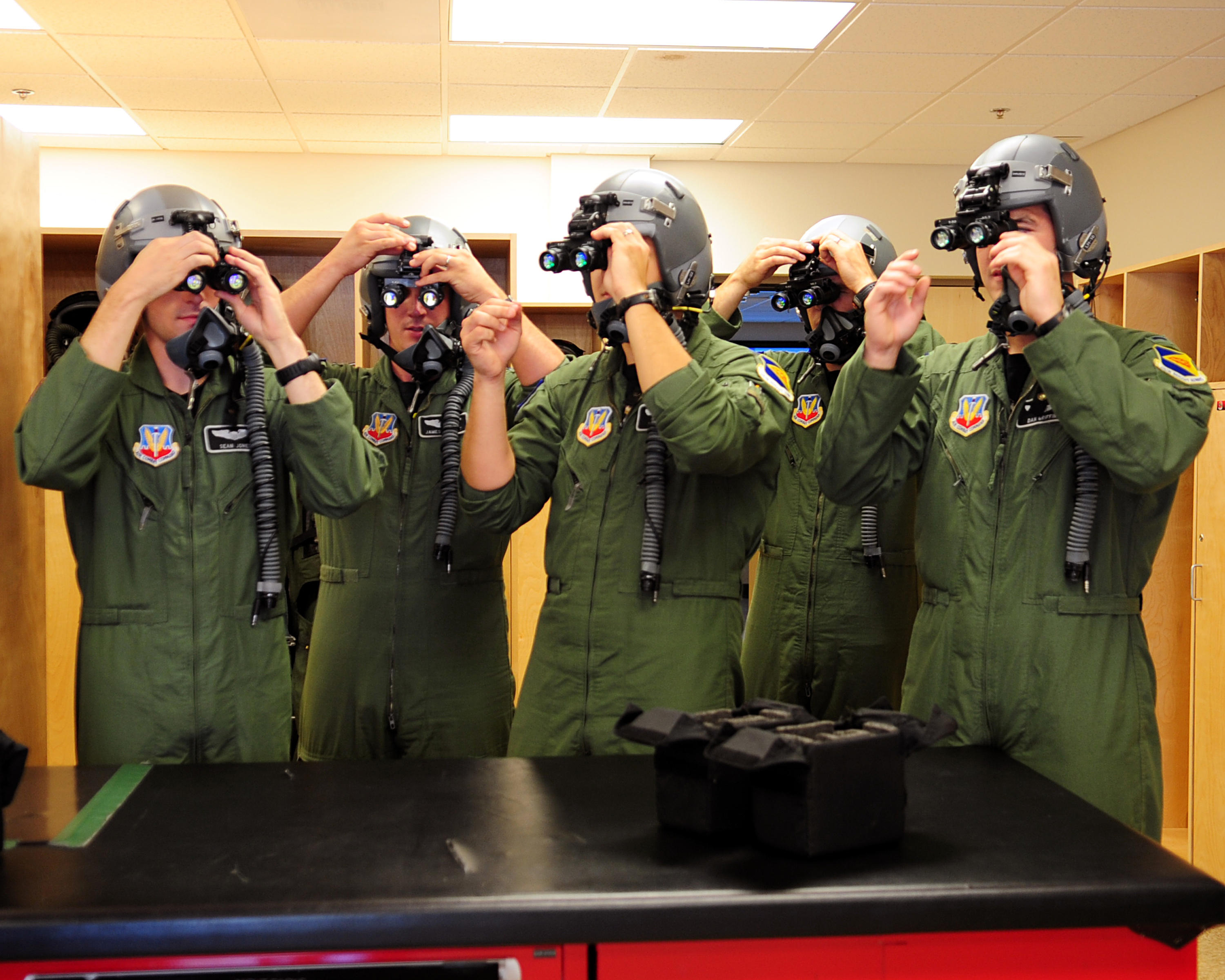 From left: Capt. Sean Jones, 1st Lt. James Schmidt, Capt. Mike Dumas, Capt. Patrick Chapman and 1st Lt. Dan Griffin, all pilots from the 358th Fighter Squadron, adjust the alignment of their night vision goggles here June 9. As part of the A-10C Pilot Initial Qualification course curriculum, the pilots must learn to execute night flying missions using night vision goggles. They’ll accomplish this over the next few weeks through six hours of academic classes, five hours in the A-10 full mission trainer, also known as a simulator, and eight flights. (U.S. Air force photo/Airman 1st Class Jerilyn Quintanilla)