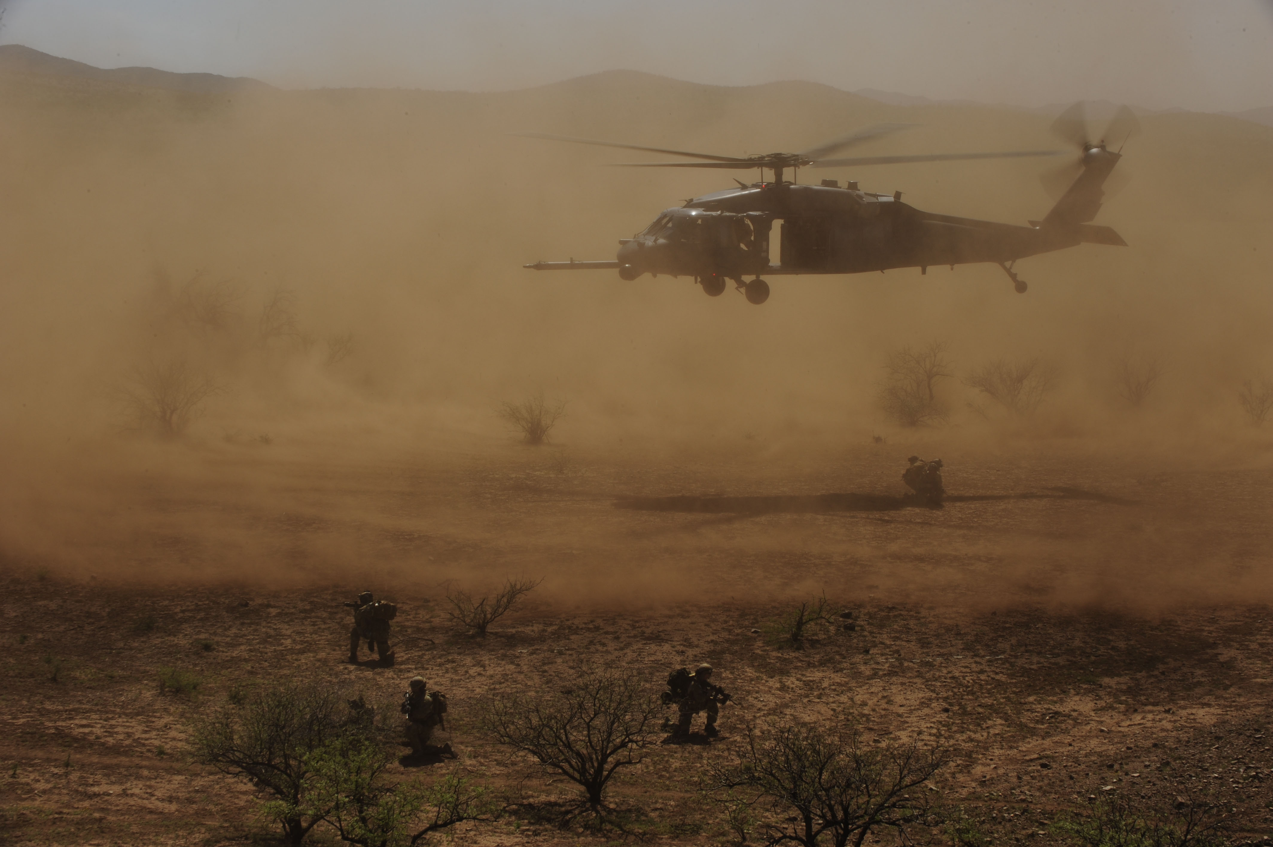 A U.S. Air Force HH-60 with the 210th Rescue Squadron (RQS, Alaska Air National Guard (ANG), Kulis ANG Base, Anchorage, Alaska, drops off pararescuemen from the 210 RQS, and the 103 RQS, New York ANG, Long Island, N.Y., during Angel Thunder 10 in the desert surrounding Davis-Monthan Air Force Base, Tucson, Ariz., April 15, 2010. Angel Thunder 10, an Air Combat Command (ACC) sponsored exercise, will be the largest personnel recovery/CSAR (Combat Search and Rescue) exercise to date, combining DoD (Department of Defense) and non-DoD assets. (U.S. Air Force photo by Staff Sgt. Joshua L. DeMotts)