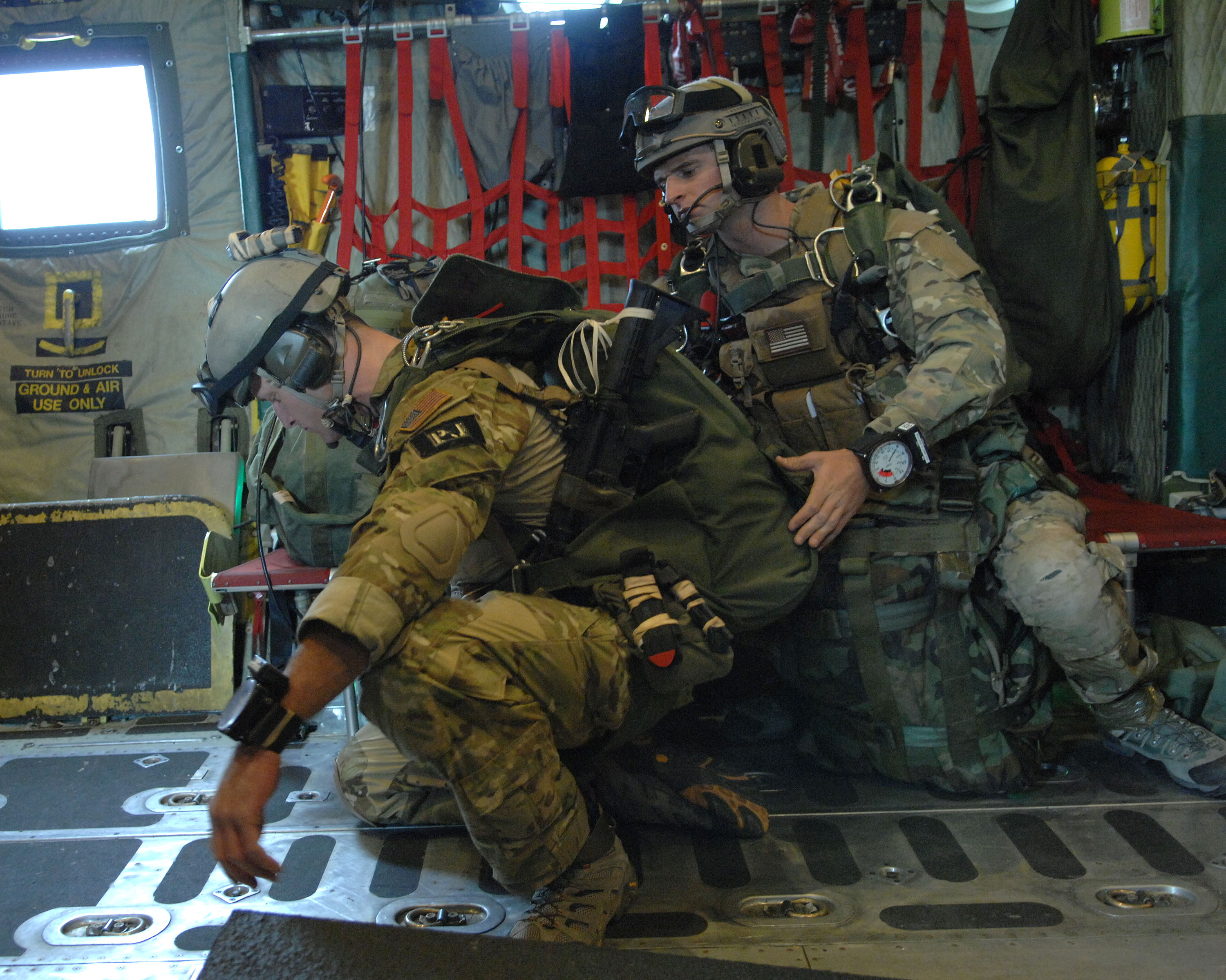 Pararescuemen from the 48th Rescue Squadron at Davis-Monthan Air Force Base perform buddy checks on their equipment before parachuting from a C-130 Hercules during Exercise Angel Thunder April 16. Angel Thunder 2010 is a joint service, multinational, interagency combat search and rescue exercise designed to provide realistic training to U.S. Air Force personnel recovery assets using a variety of scenarios to simulate deployment conditions and contingencies and natural disasters. (U.S. Air Force photo/Staff Sgt. Alesia Goosic)