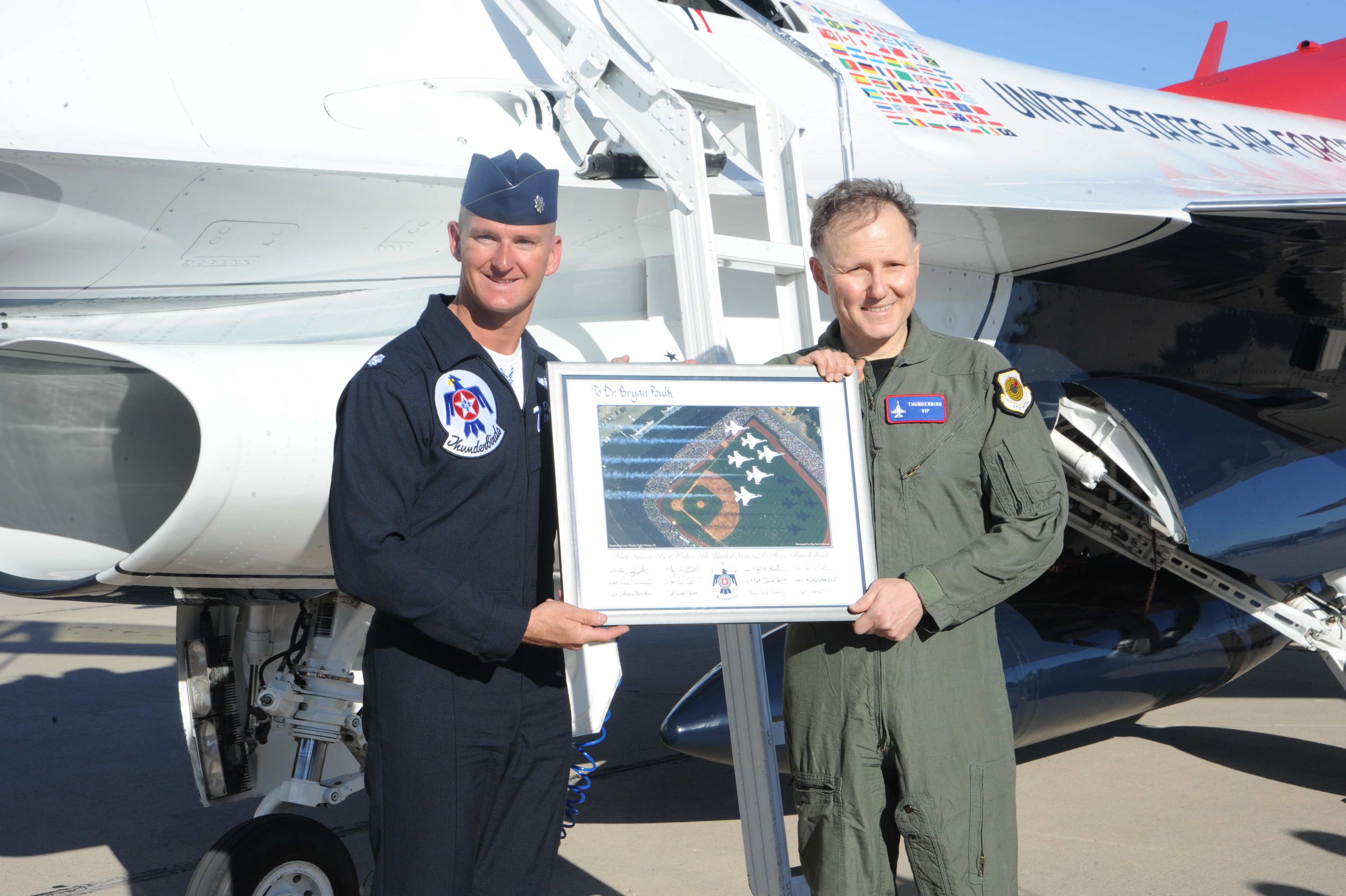 Lt. Col. Derek “Taz” Routt, operations officer and pilot for the United States Air Force Thunderbirds, presents a signed lithograph from the team to Dr. Bryan Foulk, local dentist and longtime Tucson resident, on the flight line here March 18. Dr. Foulk was selected as Pima County’s Hometown Hero based on his extensive service to the community. The Hometown Hero program allows the Air Force to highlight similar efforts of extraordinary Americans who are doing their part in their communities and who display the same pride, excellence and service that Airmen show every day. (U.S. Air Force photo/Airman Jerilyn Quintanilla)