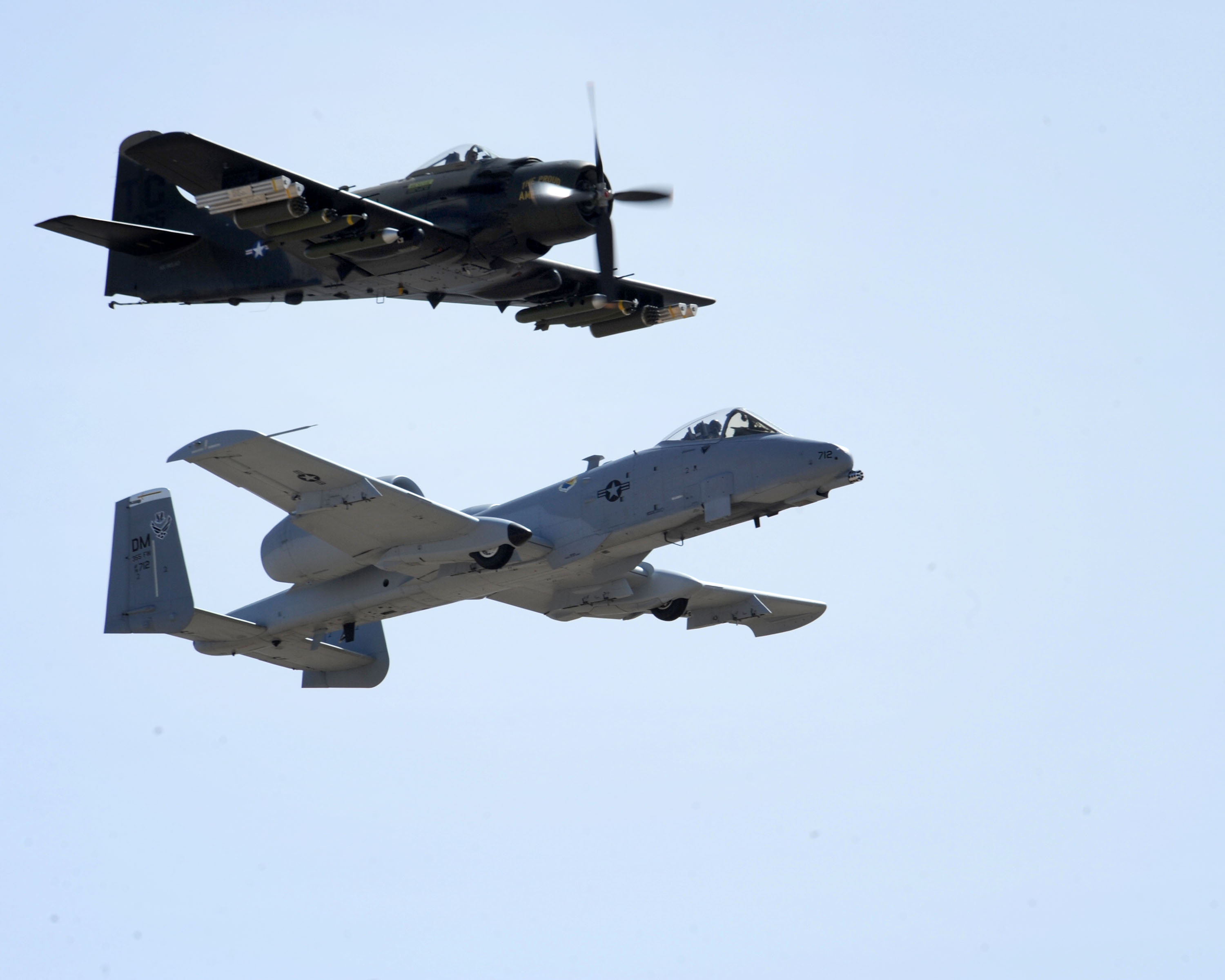 An A-10 Thunderbolt II flies in formation with an A-1 Skyraider as part of the Heritage Flight during the Aerospace and Arizona Days air show here March 21. The Heritage Flight made its debut in 1997 to celebrate the Air Force’s 50th birthday and is now part of air shows around the world. (U.S. Air Force photo/Airman Jerilyn Quintanilla)