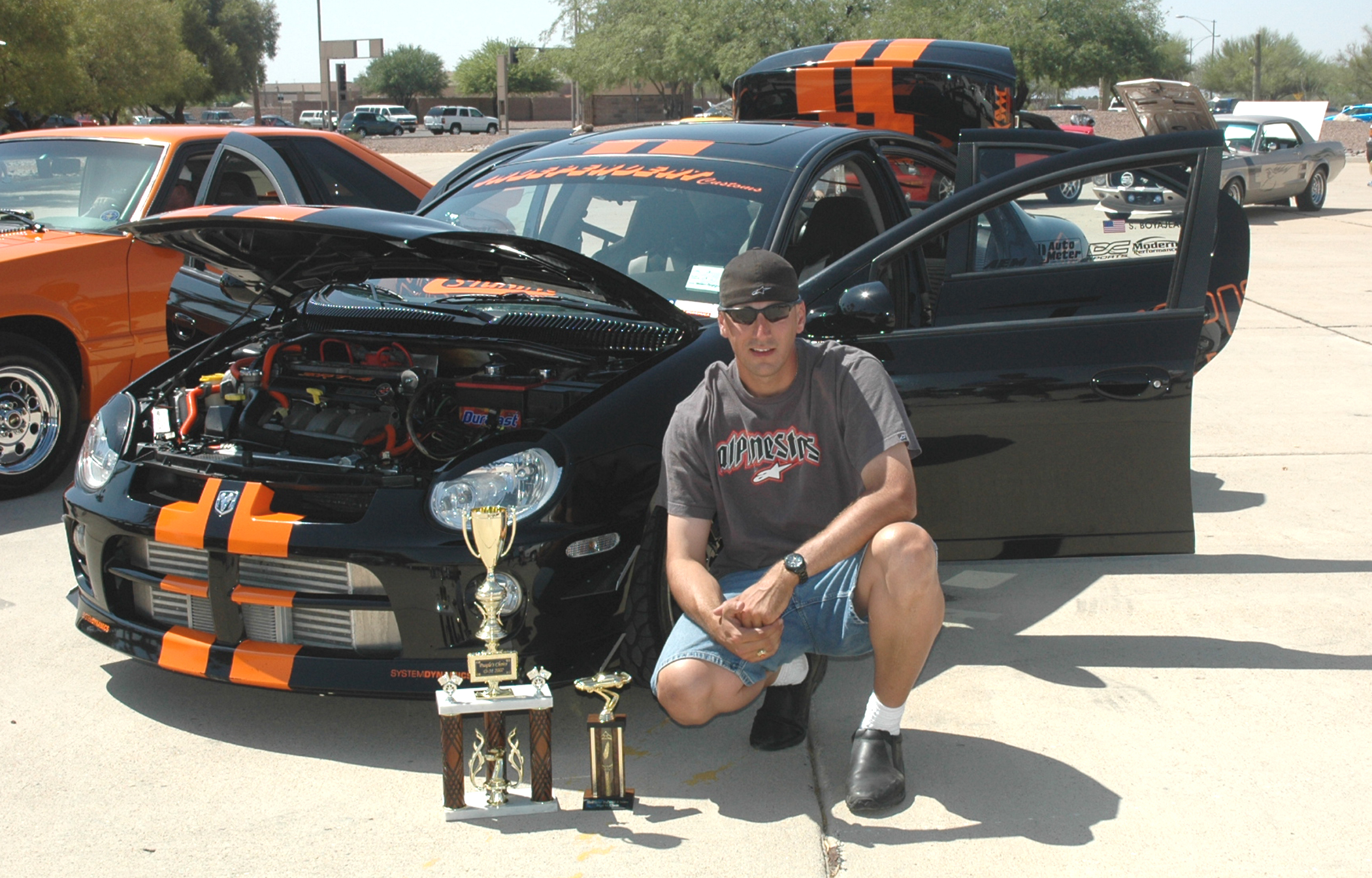 Army Sgt. Sheldon Boyajean, a military policeman at Fort Huachuca, Ariz., poses in front of his 2004 Dodge SRT 4, which won the “People’s Choice” award at the Armed Forces Day Car and Motorcycle Show here May 19. (U.S. Air Force photo/Airman Jamie Coggan)