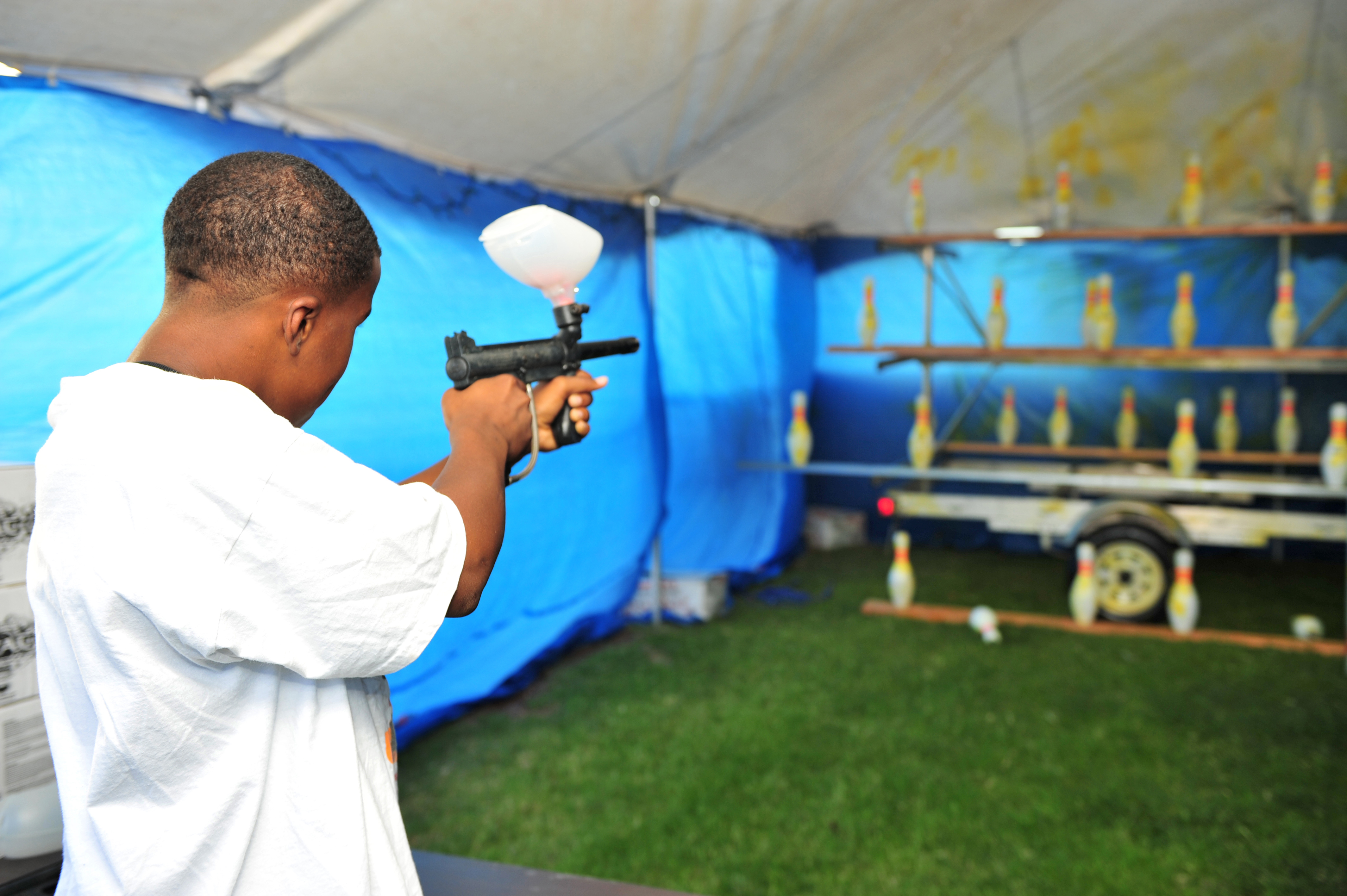Diquan Hubbard, son of Technical Sgt. Samuel Hubbard of the 355th Force Support Squadron, shoots a paintball gun during the Fourth of July celebration here July 4. The celebration featured games like the dunk tank, water balloon toss, inflatable jumpers, and a paintball gun shoot, along with a military working dog demonstration and fireworks. (U.S. Air Force photo/Senior Airman Noah R. Johnson)