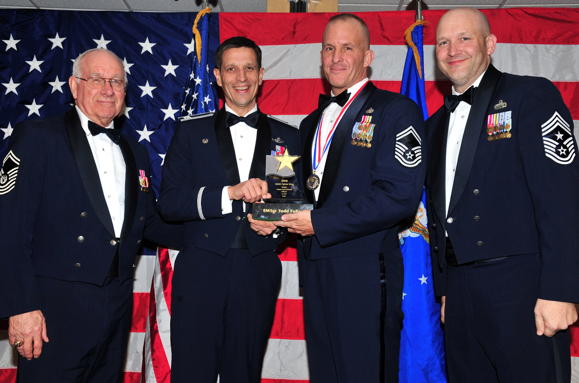 Senior Master Sgt. Todd Fuller of the 355th Security Forces Squadron receives the 355th Fighter Wing 2008 Senior Noncommissioned Officer of the Year award from Col. Paul T. Johnson, 355th FW commander. Also pictured: Retired Chief Master Sgt. of the Air Force (No. 8) Sam Parish (far left) and 355th FW Command Chief Master Sgt. Thomas Schwenk. (U.S. Air Force photo/Senior Airman Noah Johnson)