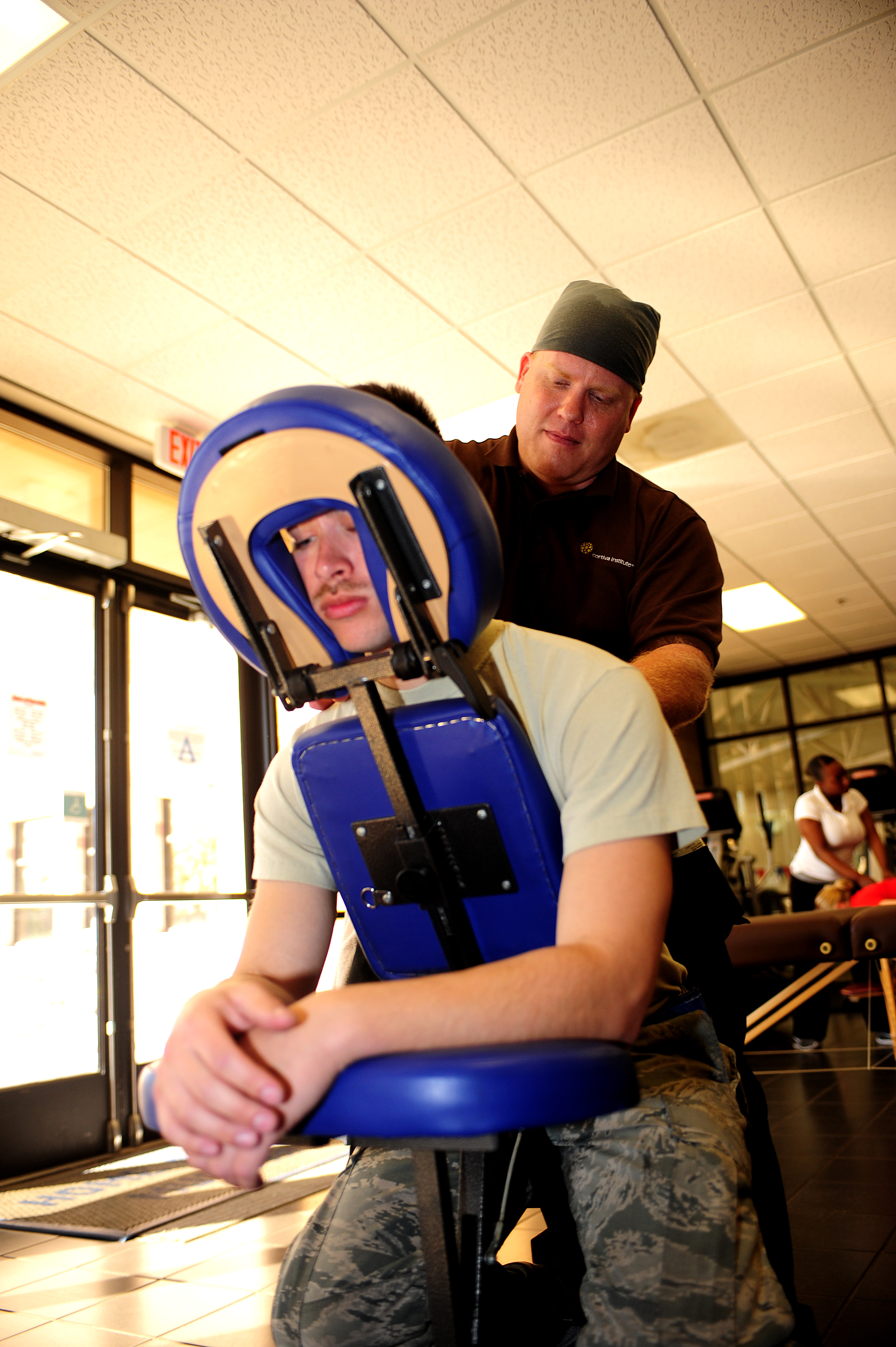 U.S. Air Force Master Sgt. David Hanneman, 355th Maintenance Group aerospace propulsion technician, gives Airman 1st Class Clint Black, 355th Equipment Maintenance Squadron aircraft structural maintenance technician, a 15 minute massage during Comprehensive Airmen Fitness Day at Davis-Monthan Air Force Base, Ariz., March 3, 2014. This CAF day focuses on the physical pillar, this pillar emphasizes performing and excelling in physical activities that require aerobic fitness, endurance, strength, flexibility and body composition derived through exercise, nutrition and training. (U.S. Air Force Photo by Senior Airman Camilla Elizeu/Released)