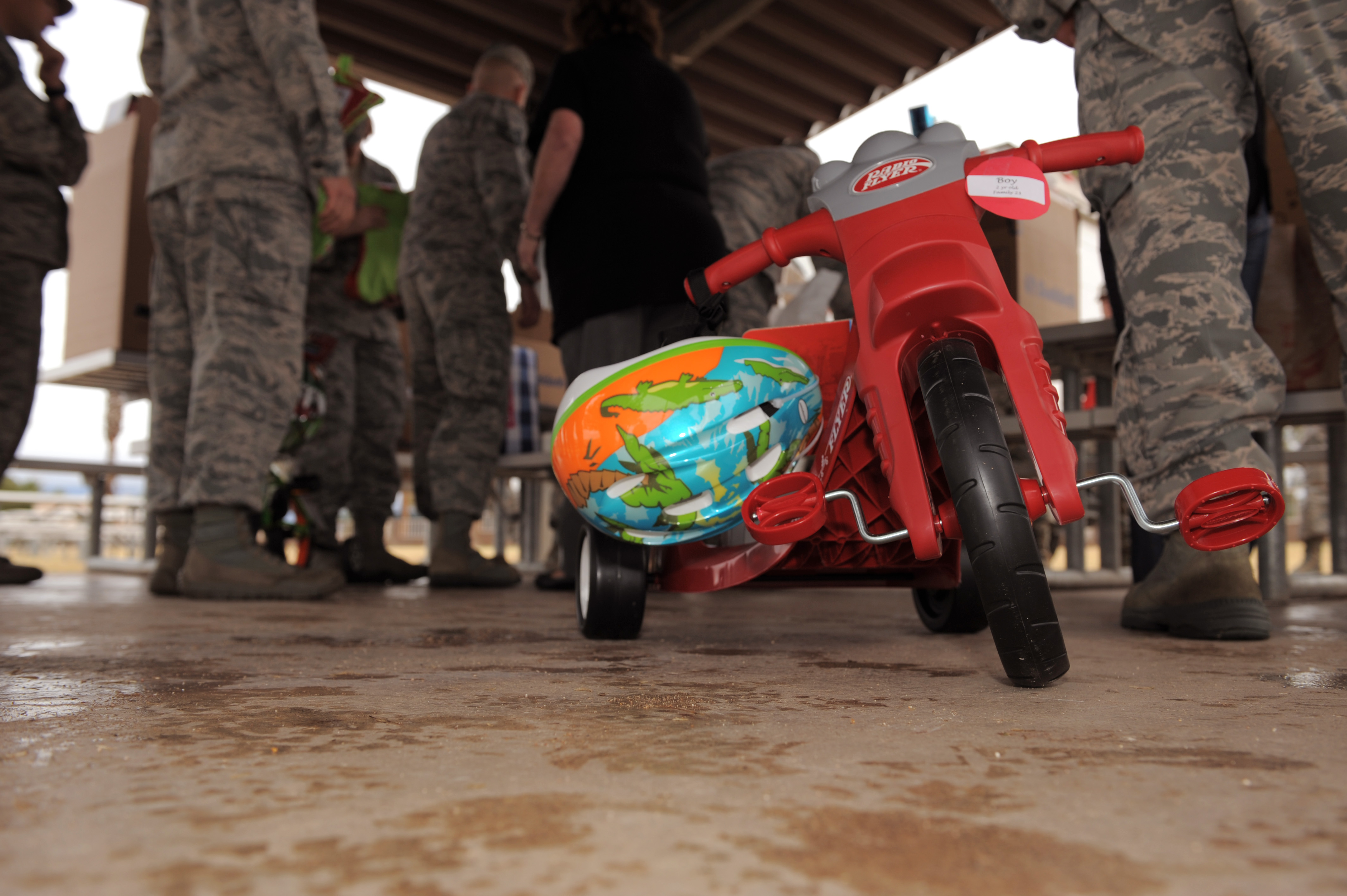 A tricycle was one of many donations made by community supporters to deserving families of junior Airmen via Operation Warmheart at Davis-Monthan Air Force Base, Ariz., Dec. 18, 2014. Operation Warmheart is a non-profit organization that distributes charitable donations to service members and their families all year long. (U.S. Air Force photo by Airman 1st Class Chris Drzazgowski/Released)