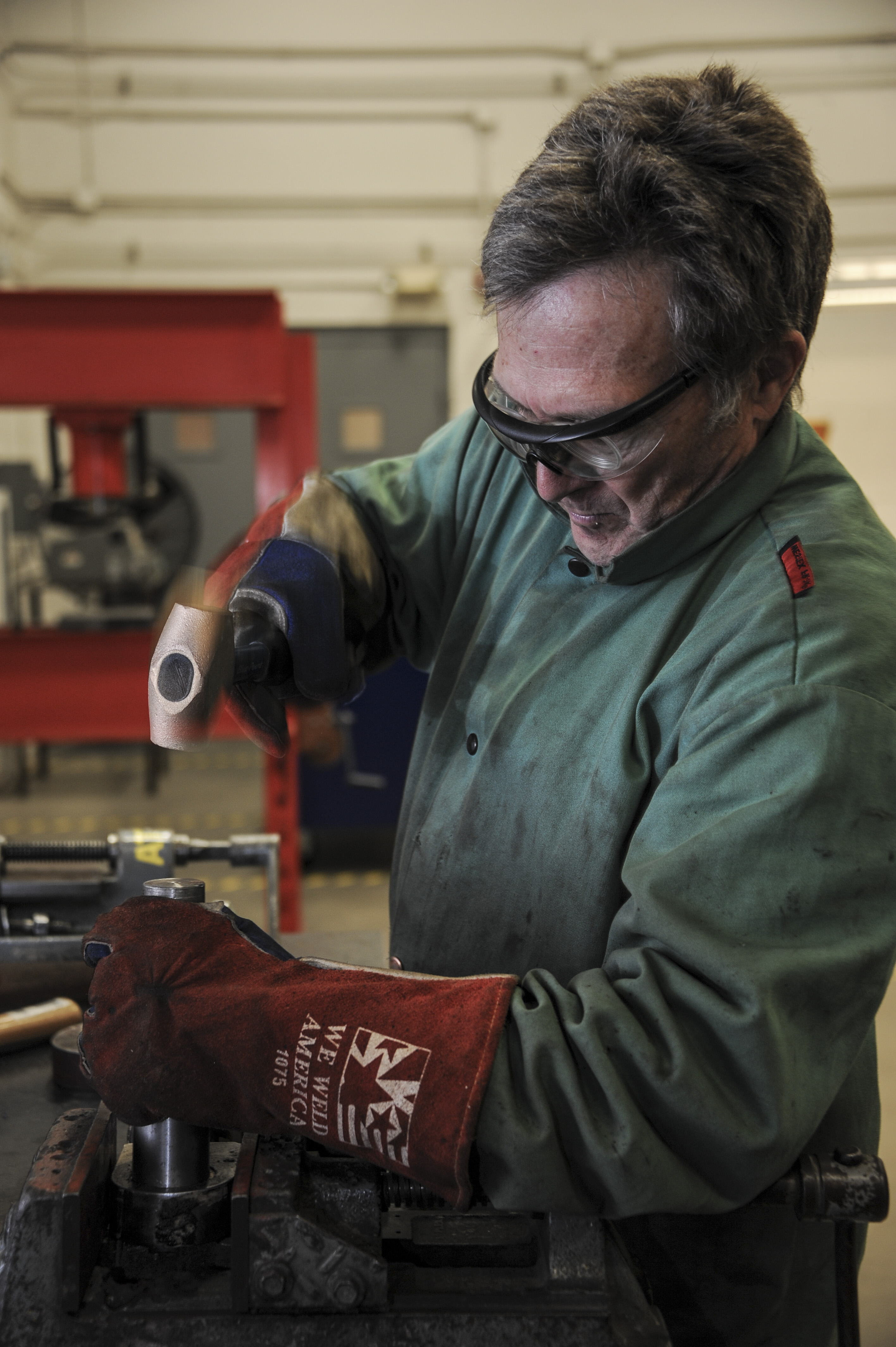 Paul Proffitt, 355th Logistics Readiness Squadron mobile equipment medal mechanic, hammers a bushing into a steering actuator at Davis-Monthan Air Force Base, Ariz., Feb. 17, 2016. The bushing was placed onto dry ice in order to shrink it allowing it to be placed into the steering actuator before expanding. (U.S. Air Force photo by Airman 1st Class Ashley N. Steffen/Released)