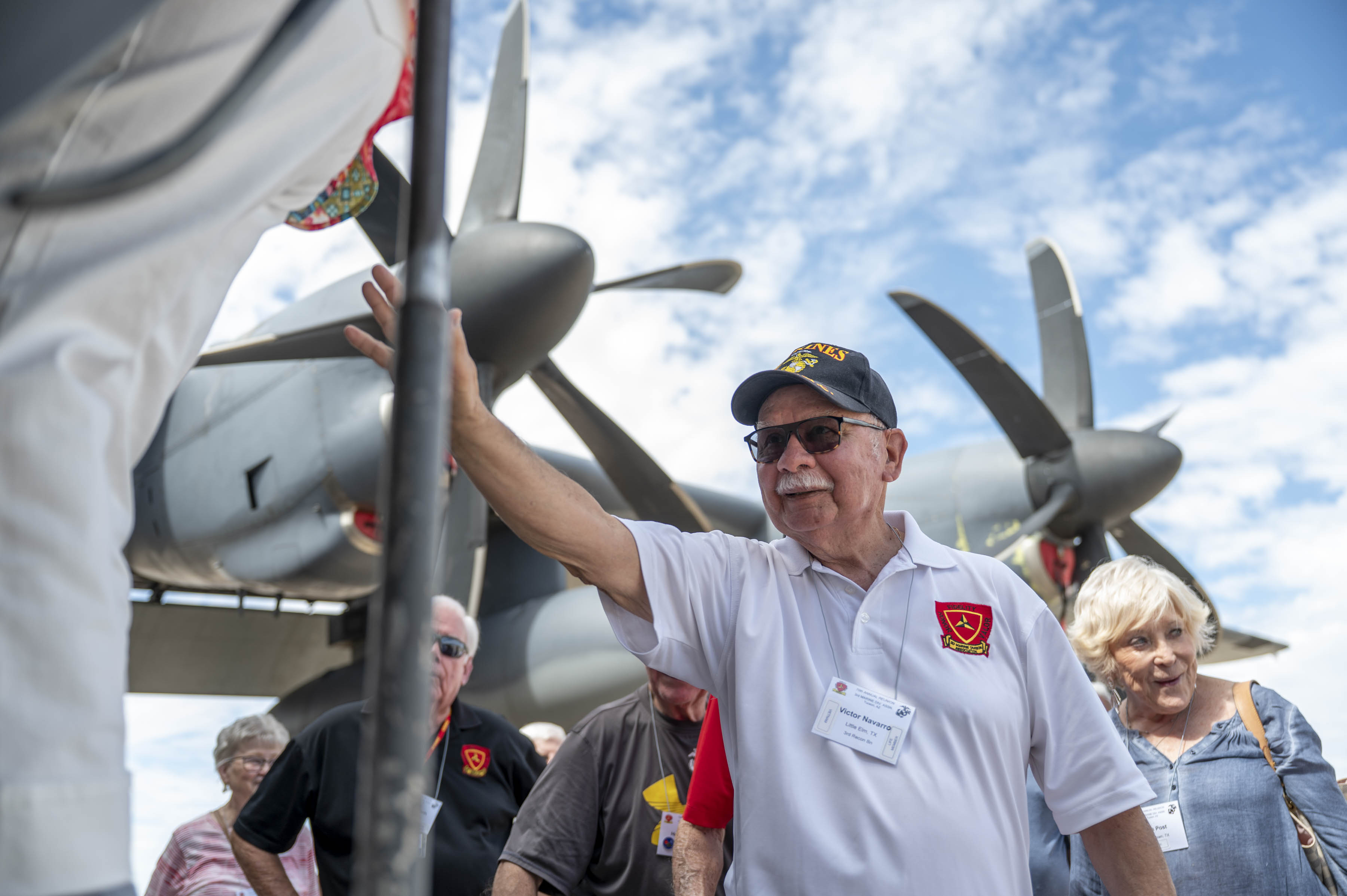 U.S. Air Force Col. Jose Cabrera, 355th Wing commander, right, and Chief Master Sgt. Kelvin Hatcher, 355th Wing command chief, left, pose with an honorary football during a DM50 event held at the University of Arizona football game in Tucson, Ariz., Sept. 6, 2025. DM50 hosts more than a dozen community and military events each year to advocate locally and nationally for Davis-Monthan Air Force Base. (U.S. Air Force photo by Senior Airman Jhade Herrera)